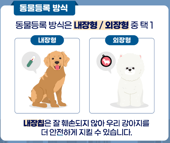 외부 등록 : 반려견 목줄에 인식표를 부착하는 방법입니다. 외출 시 반려견에게 부착되어 있는지 확인하는 것이 필수적입니다.